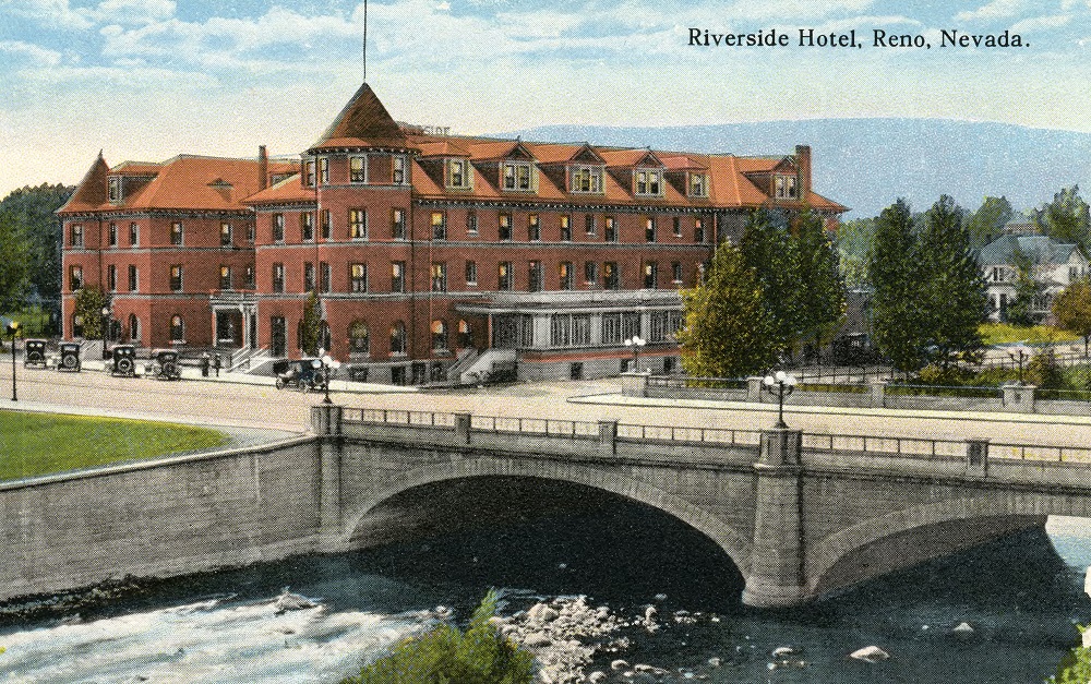 The Riverside Hotel building constructed and operated by H.J. Gosse stood at the southwest corner of the Virginia Street Bridge from 1906 to 1922, when it burned down.