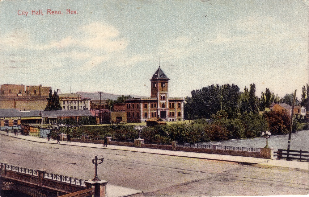 A promotional postcard pictured Reno's new City Hall in 1908, prior to the construction of the new Federal Building and Post Office that would be built on Virginia Street between First Street and the river in 1909. This photo looks northeast over the Virginia Street Bridge from the Riverside Hotel on the south bank of the river.