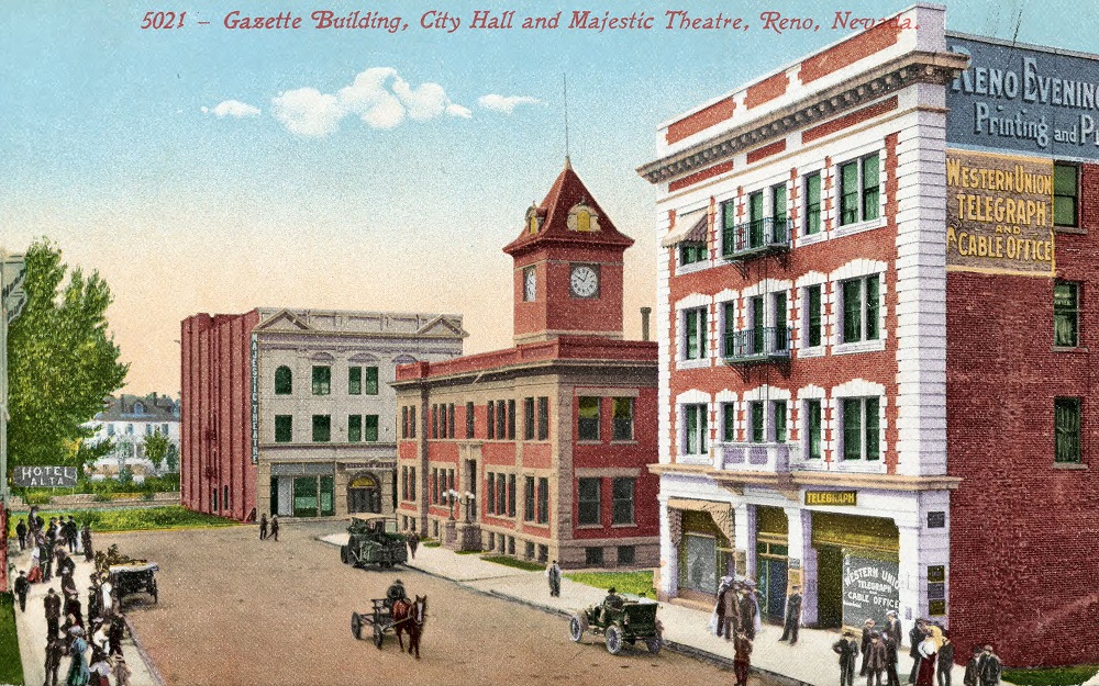 A postcard view looking southwest from N. Center Street shows Reno City Hall at the corner of Center and First Streets, with the Gazette Building just to its north and the Majestic Theatre on the opposite side of First Street.
