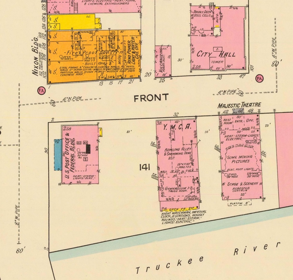 The Sanborn Fire Insurance map of Reno published in 1918 shows the relationship of Reno City Hall to other landmarks at the time, including the Post Office/Federal Building, the Y.M.C.A, and the Majestic Theatre, all of which stood on the opposite side of Front Street (since renamed East First Street). | Creator: Sanborn Fire Insurance Company | Date: 1918 | Source: U.S. Library of CongressDownload Original File