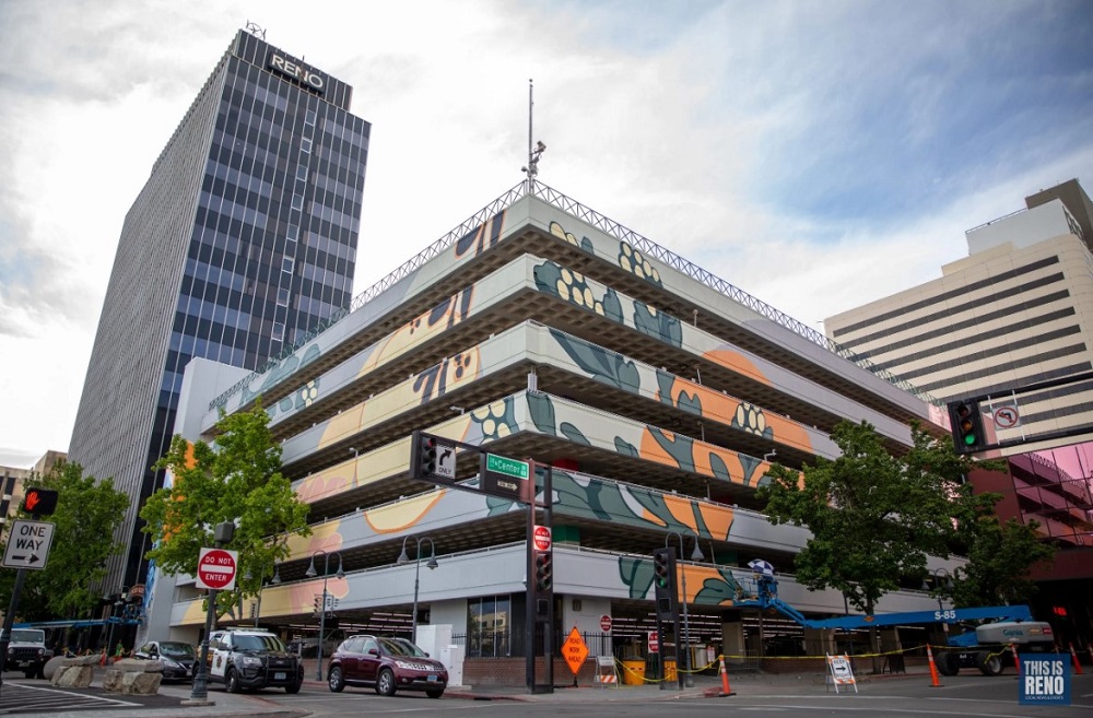 The City Hall building was demolished in order for the First National Bank to construct a parking garage for its new bank tower next door. In 2004, the bank tower became Reno's new City Hall, and the City later purchased the parking garage. A mural by Charly and Sam Malpass titled "Bluebirds Among Sage" was painted on the structure in 2022. | Creator: Eric Marks | Date: 2022 | Source: This is RenoDownload Original File