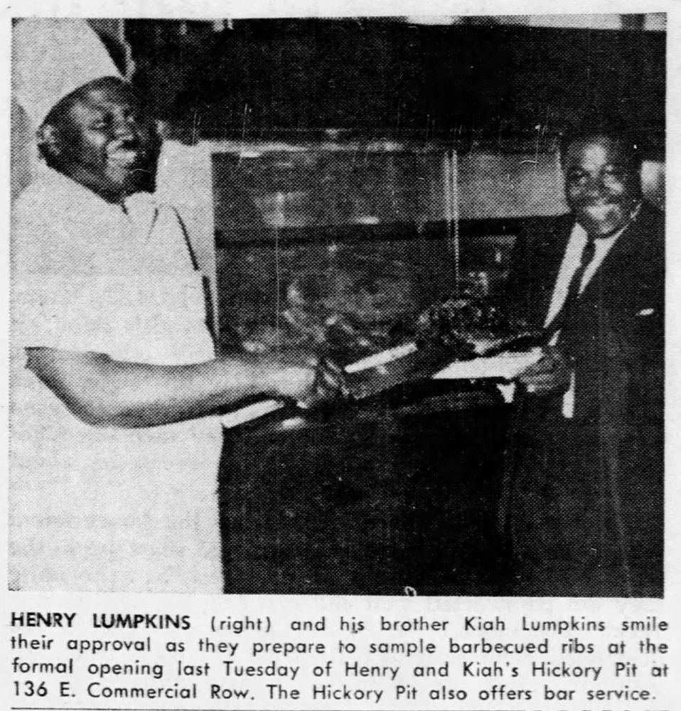 The Lumpkin brothers at the Hickory Pit ID: 2068 | This file appears in: Kiah's Squeeze Inn (site) Kiah Lumpkin (left) and his brother Henry pose at the opening of their joint venture, Henry and Kiah's Hickory Pit, which opened at 136 E. Commercial Row in 1962. | Date: November 16, 1962 | Source: Reno Evening Gazette Download Original File SourceReno Evening GazetteDateNovember 16, 1962 "The Lumpkin brothers at the Hickory Pit" appears in: Kiah's Squeeze Inn (site)