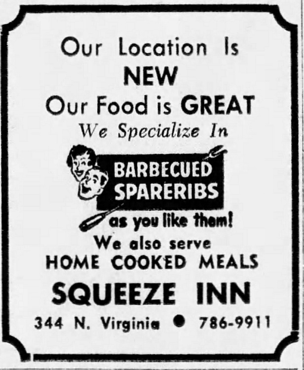 Kiah's Squeeze Inn ad ID: 2070 | This file appears in: Kiah's Squeeze Inn (site) An advertisement for Kiah Lumpkin's Squeeze Inn highlighted the restaurant's barbecued spare ribs. | Date: May 26, 1971 | Source: Reno Evening Gazette Download Original File SourceReno Evening GazetteDateMay 26, 1971 "Kiah's Squeeze Inn ad" appears in: Kiah's Squeeze Inn (site)