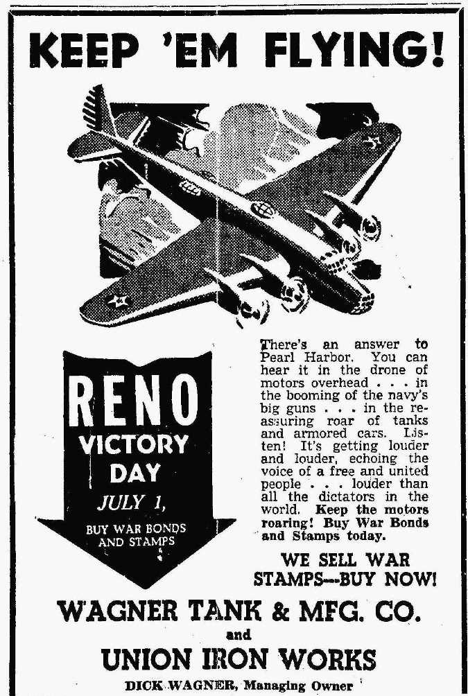 During World War II, war bonds and stamps were for sale at the combined Wagner Tank & Manufacturing and Union Iron Works, which had recently been joined to form a plant with more than 16,000 feet of floor space. | Date: June 30, 1942 | Source: Reno Evening GazetteDownload Original File