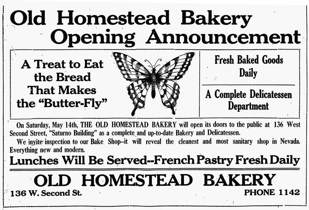 An early tenant, the Old Homestead Bakery served lunch and pastries daily. Through the years, a number of bakeries, cafes, and bars operated in the building. | Date: May 12, 1910 | Source: Reno Evening GazetteDownload Original File