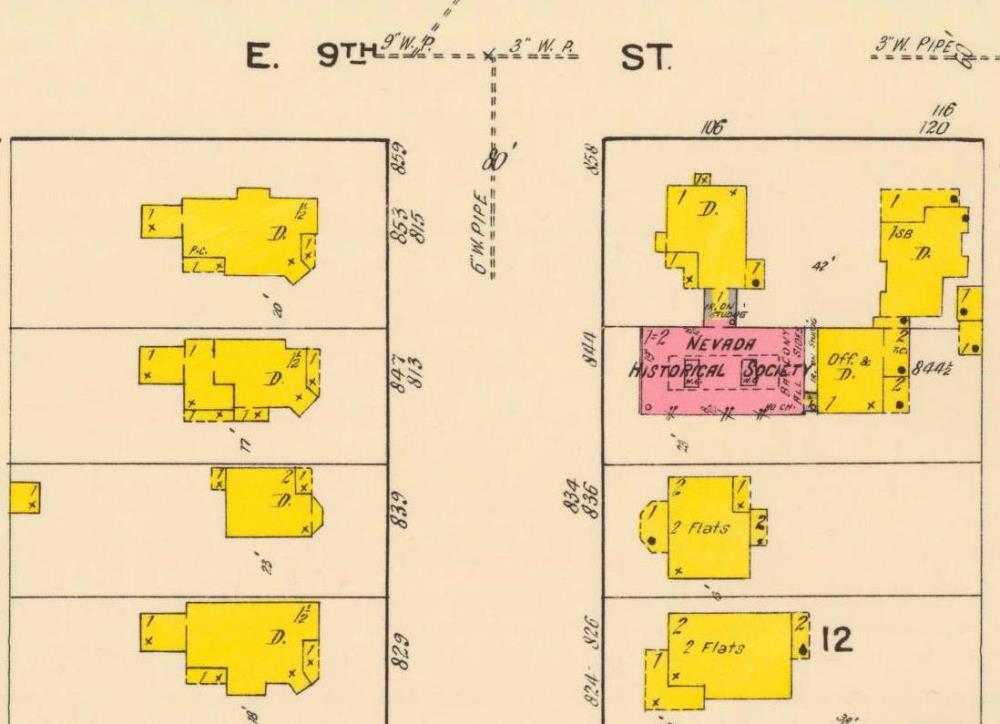 A Sanborn fire insurance map from 1918 shows the wood-frame homes on either side of Center Street in yellow and the brick Nevada Historical Society building (since demolished) in pink. The Mary Sherman House is second from the top on the west (left) side of the street. The "D" indicates that the structure was a dwelling. | Creator: Sanborn Fire Insurance Company | Date: 1918 | Source: U.S. Library of CongressDownload Original File