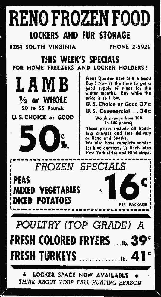 Diversified business, 1954 ID: 1098 | This file appears in: Ponderosa Meat Company By the mid-1950s, Reno Frozen Food Lockers sold frozen vegetables and a variety of meats in addition to offering locker rentals and fur storage. | Date: July 22, 1954 | Source: Reno Evening Gazette Download Original File SourceReno Evening GazetteDateJuly 22, 1954 "Diversified business, 1954" appears in: Ponderosa Meat Company