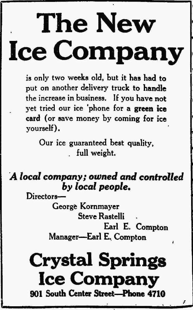 Early Success ID: 1101 | This file appears in: Crystal Springs Ice Company A 1930 advertisement boasts of the company's successful opening weeks. Customers placed a green “ice card” in their windows to indicate how many pounds of ice to deliver. | Date: June 27, 1930 | Source: Reno Evening Gazette Download Original File SourceReno Evening GazetteDateJune 27, 1930 "Early Success" appears in: Crystal Springs Ice Company