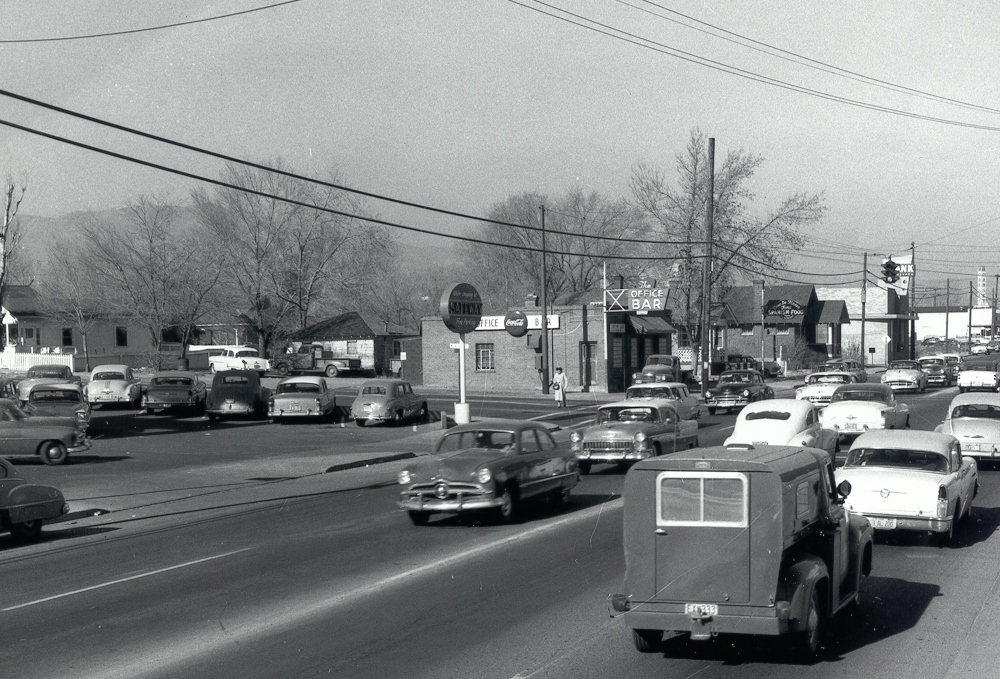 Looking northward along South Virginia Street, the left foreground is occupied by the parking lot for the new Safeway. Then called the Office Bar, the corner tavern was flanked on its north side by the Casa de Flores. Further north is the vertical sign for the Washoe Market. | Date: ca. 1955 | Source: Nevada Department of TransportationDownload Original File