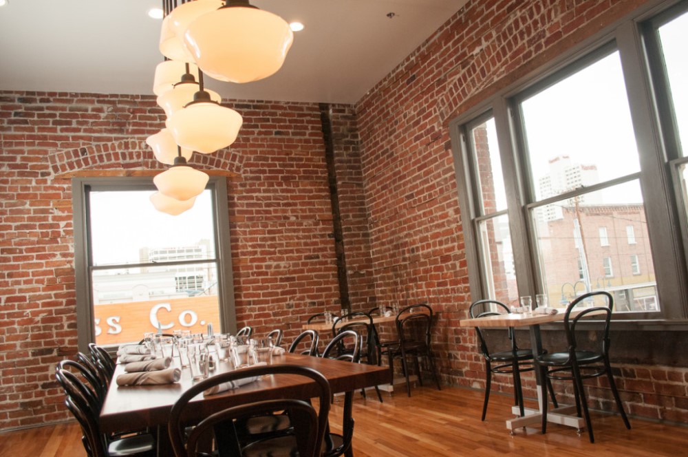 The second floor dining area of The Depot Craft Brewery Distillery features the original exposed brick and window openings, through which the surrounding buildings on East 4th Street can be viewed. | Creator: The Depot Craft Brewery DistilleryDownload Original File