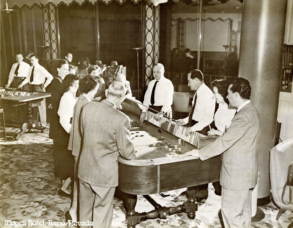 Guests play craps at the Mapes ID: 121 | This file appears in: Mapes Hotel (site) Guests play craps in a photo taken sometime soon after the hotel's opening. | Source: Special Collections, University of Nevada, Reno Libraries Download Original File SourceSpecial Collections, University of Nevada, Reno Libraries "Guests play craps at the Mapes" appears in: Mapes Hotel (site)