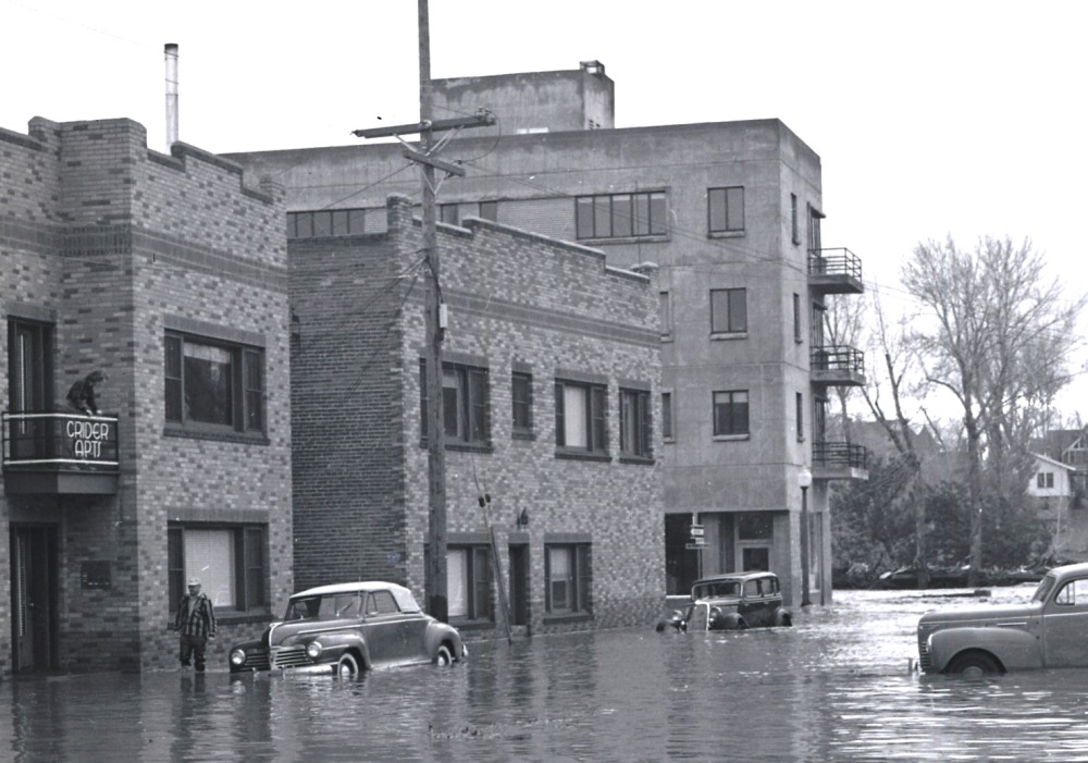 A photo by Roy Curtis taken from Roff Way, just to the north, shows the west end of the Hughes building during the 1950 flood. In the foreground is the Crider Building, constructed in 1936. | Date: 1950 | Source: Special Collections, University of Nevada, Reno LibrariesDownload Original File