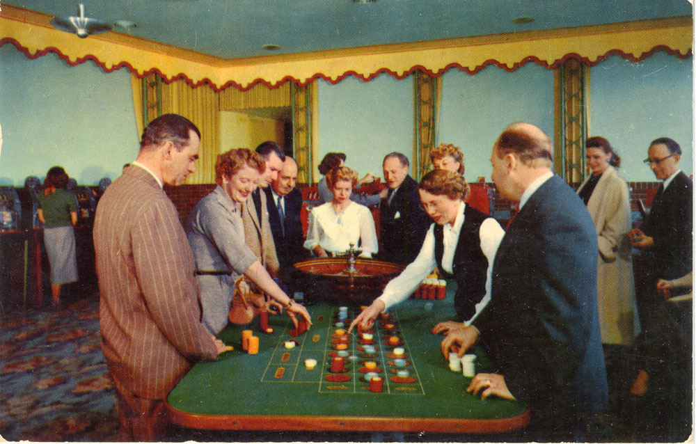 A postcard dated 1956 shows guests gambling in the Sky Room. The caption reads, "City and state proceeds from gambling are used in the alleviation of debts which in other states can only be satisfied with the additional taxation of the citizens."
