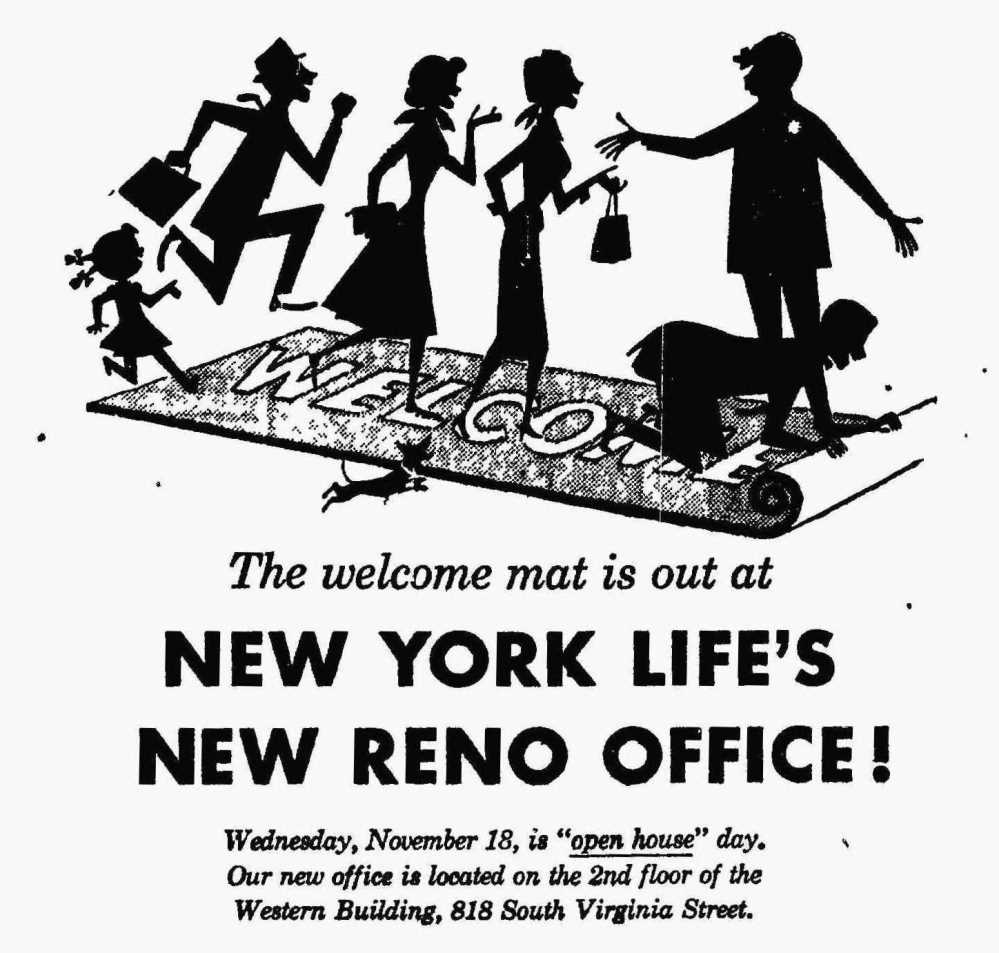 New York Life, 1953 ID: 1303 | This file appears in: Western Building A jaunty newspaper advertisement in November of 1953 welcomes the offices of New York Life to the Western Building. | Date: November 17, 1953 | Source: Reno Evening Gazette Download Original File SourceReno Evening GazetteDateNovember 17, 1953 "New York Life, 1953" appears in: Western Building