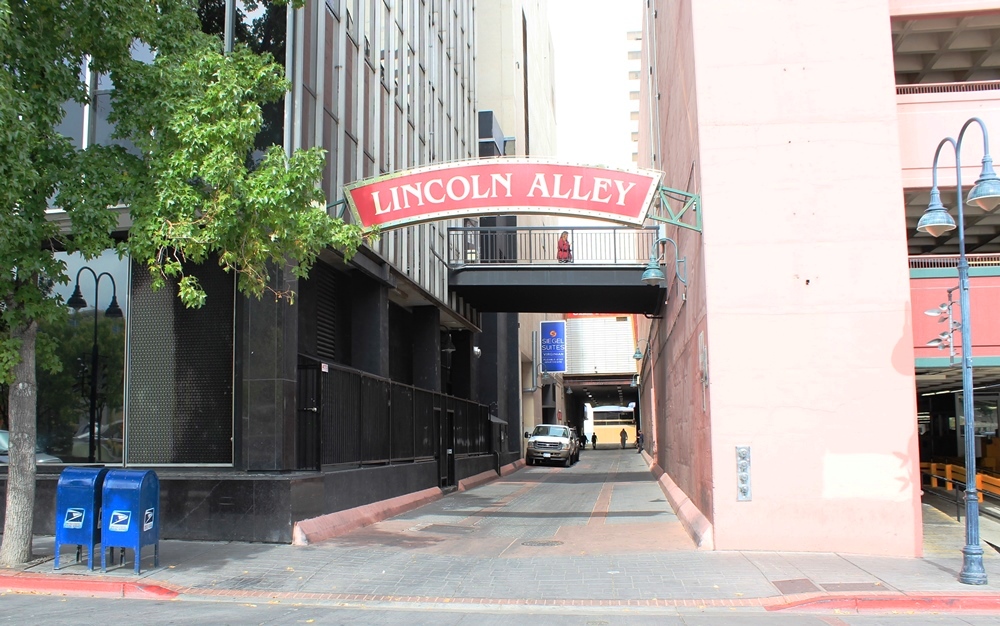 Lincoln Alley, 2016 ID: 1376 | This file appears in: Lincoln Alley A pedestrian crosses the skywalk that connects Reno City Hall on the left with the parking garage on the right. | Creator: Alicia Barber | Date: 2016 Download Original File CreatorAlicia BarberDate2016 "Lincoln Alley, 2016" appears in: Lincoln Alley