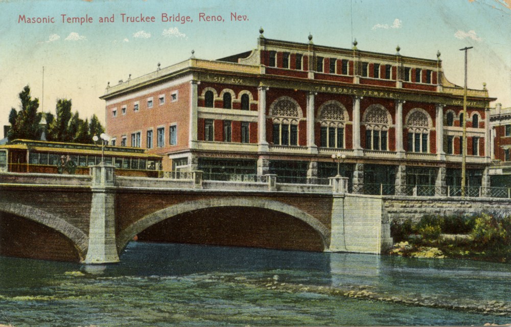 Crossing the bridge ID: 1378 | This file appears in: Reno Traction Company (site) The streetcar tracks were extended across the Virginia Street Bridge after the new bridge was constructed in 1905. | Source: Lewis "Red" Kittell Download Original File SourceLewis "Red" Kittell "Crossing the bridge" appears in: Reno Traction Company (site)