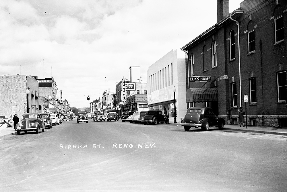 Upon the construction of the commercial building to its north in 1937, the Elks Home gained a new entrance on North Sierra Street. Looking north from the Sierra Street bridge, this photo shows the busy shopping district north of the river.