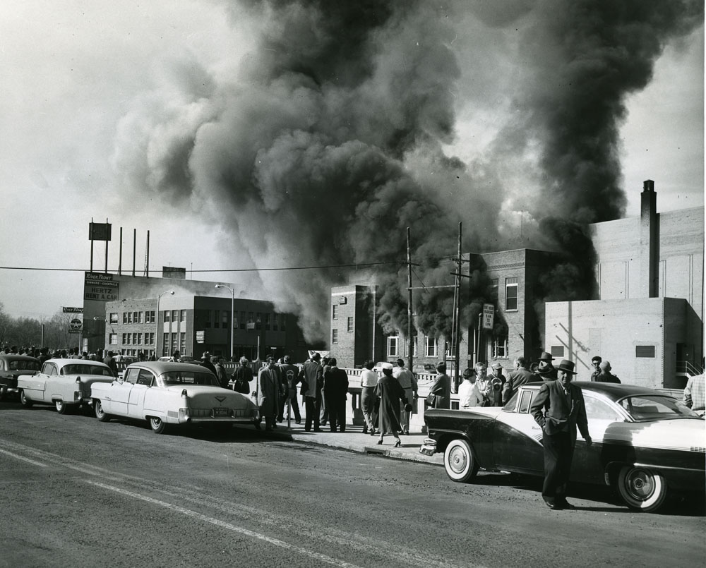 Crowds gather to watch the fire caused by the explosion on Sierra Street on February 5, 1957.