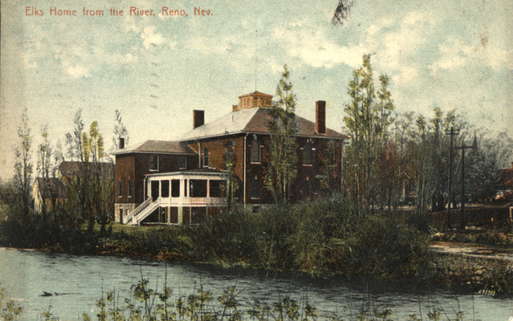 View from the river ID: 1427 | This file appears in: Reno Elks Home (site) A postcard depicts the rear of the Elks Home as seen from the south bank of the Truckee River. Note the spacious covered porch on the river side. | Source: Dick Dreiling Download Original File SourceDick Dreiling "View from the river" appears in: Reno Elks Home (site)