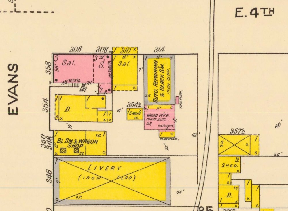 A 1918 Sanborn fire insurance map of the block shows the hotel building at the top left (the pink signifies brick construction), surrounded by wooden frame buildings, indicated in yellow. | Creator: Sanborn Fire Insurance Company | Date: 1918 | Source: U.S. Library of CongressDownload Original File