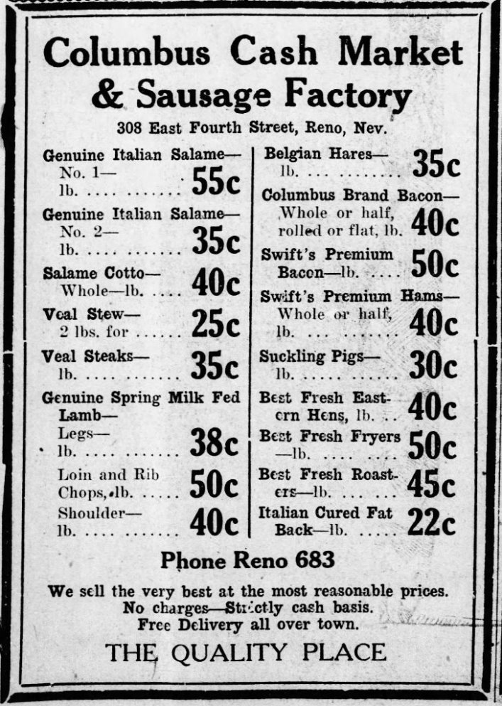 Through most of the 1920s the building's east commercial space housed the Columbus Cash Market & Sausage Factory. Operated by Italian native Goddard C. Borellini, the factory claimed to be "the only manufacturers of all kinds of Italian style sausages in the state of Nevada." | Date: April 2, 1926 | Source: Reno Evening GazetteDownload Original File