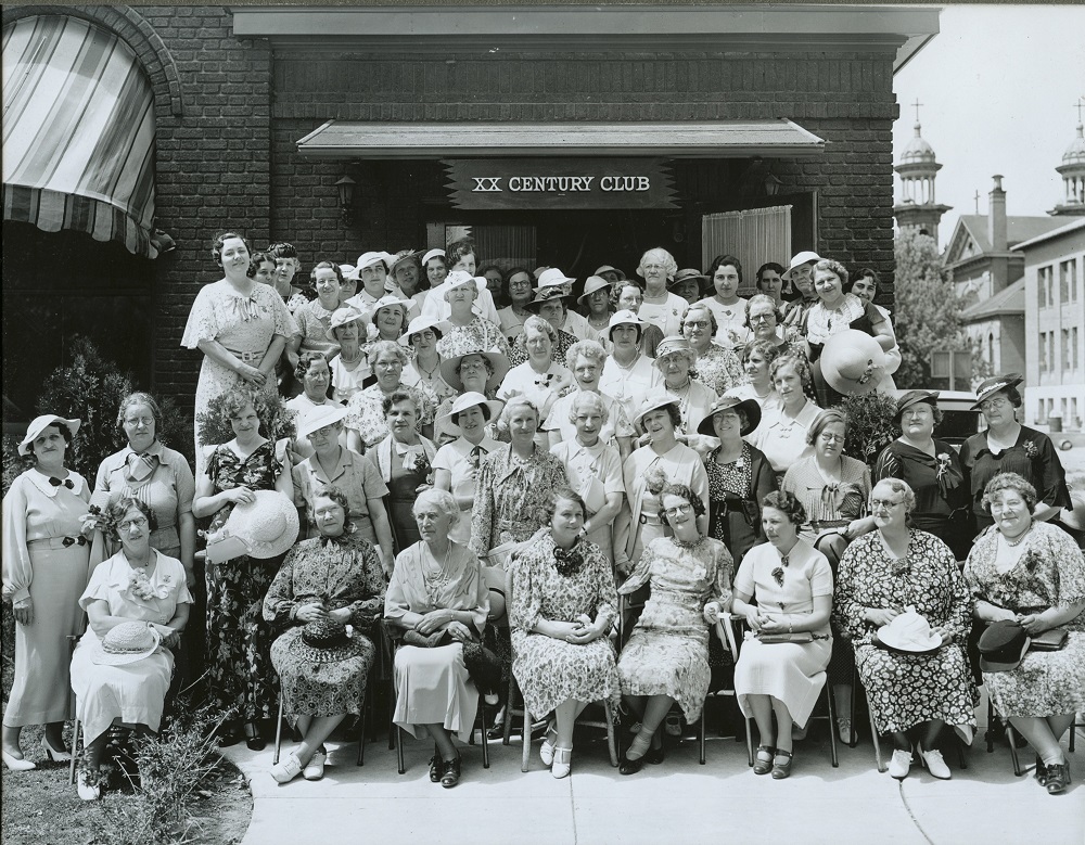 Members of the Twentieth Century Club pose outside the front of the building in the 1930s. To the right can be seen the towers of St. Thomas Aquinas Cathedral, located on the corner of Second and Arlington Streets.