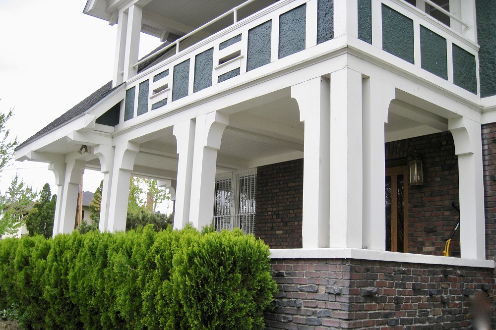 Front detail ID: 1526 | This file appears in: Price House The house's front porch features unusual flat, split supporting columns. | Creator: Donna and Paul Erickson | Date: 2014 Download Original File CreatorDonna and Paul EricksonDate2014 "Front detail" appears in: Price House
