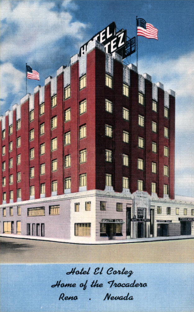 The El Cortez Hotel is one of only three remaining major Art Deco buildings in Reno. Notable details include the extensive foliated motif sculptural decoration in terra cotta on the building's base and parapet. | Source: Nevada Historical SocietyDownload Original File