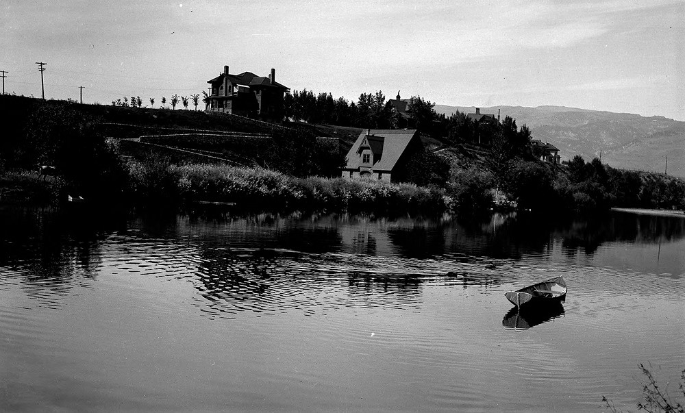 A view from the north side of the Truckee River shows the Grimmon House at the top of the bluff and the winding road leading down to the carriage house on the river side of the property.