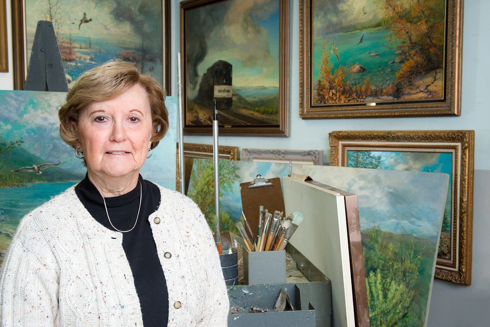 In 1974, Marilyn Marston and her artist/photographer husband, Art, purchased the building, and Art moved his studio and printing business there. Here she poses with some of his paintings. | Creator: Patrick Cummings | Date: 2012Download Original File