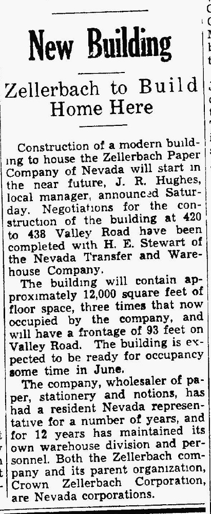 New building underway ID: 1687 | This file appears in: Zellerbach Paper Company A newspaper article in May of 1939 described plans for the new "modern" building, which would triple the size of the space then occupied by the Zellerbach Paper Company. | Date: May 7, 1939 | Source: Nevada State Journal Download Original File SourceNevada State JournalDateMay 7, 1939 "New building underway" appears in: Zellerbach Paper Company
