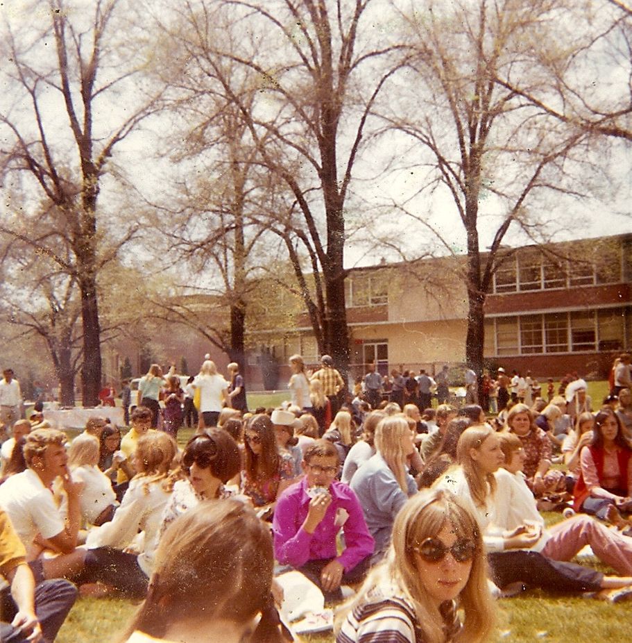 Lambda Chi Alpha (LXA) fraternity members hang out together during an event on the Quad in 1971 with Ross Hall in the background. | Date: 1971 | Source: University Archives, University of Nevada, Reno LibrariesDownload Original File