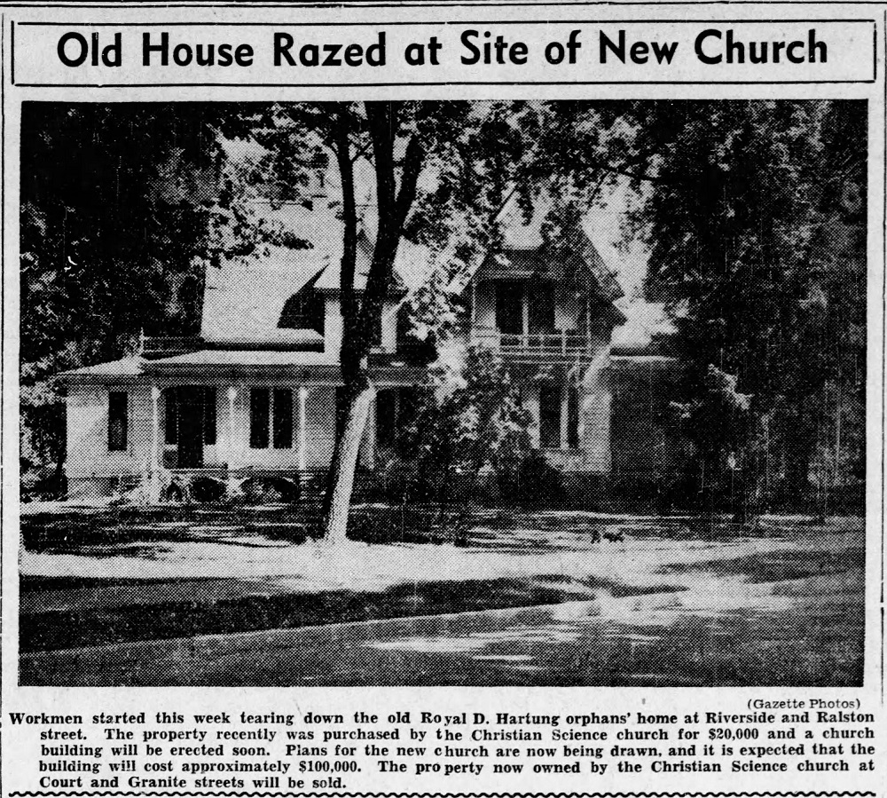 Home for Orphans ID: 1744 | This file appears in: Riverside Drive The Royal D. Hartung Home for Orphans and Foundlings was built at 501 Riverside Drive between 1908 and 1911. In 1938 it was closed and demolished to make way for the First Church of Christ Scientist, today known as the Lear Theater. | Date: March 26, 1938 | Source: Reno Evening Gazette Download Original File SourceReno Evening GazetteDateMarch 26, 1938 "Home for Orphans" appears in: Riverside Drive