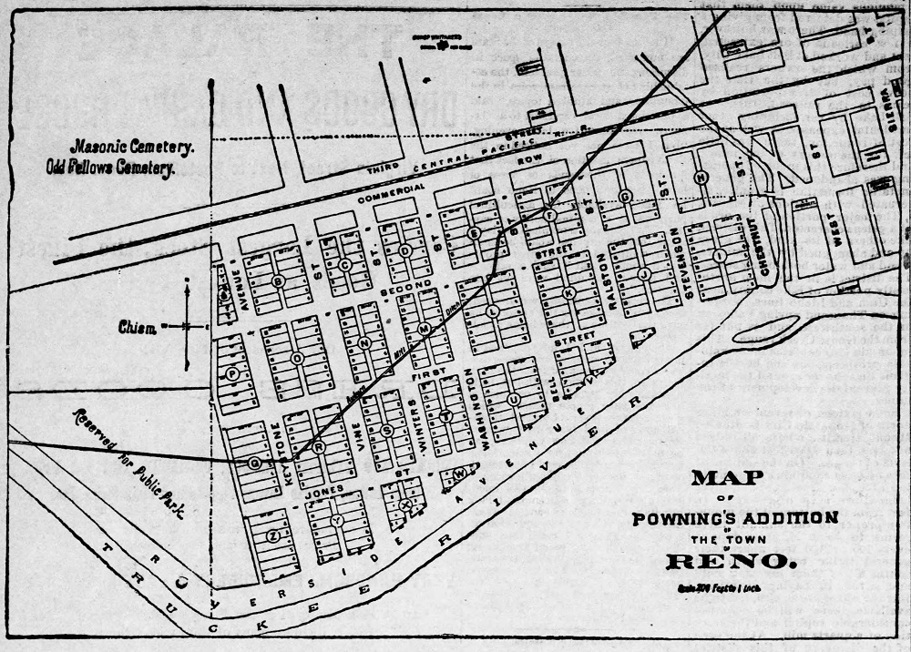 A newspaper advertisement in July of 1888 announces the sale of lots in the new Powning's Addition. The new tract retained public access to the Truckee River along Riverside Drive.