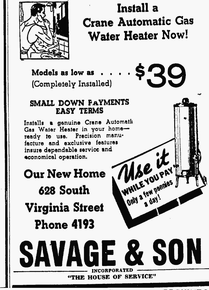 "The House of Service," August 1940 ID: 1816 | This file appears in: Savage and Son, Inc. An August 1940 newspaper ad announces Savage & Son's new home at 628 South Virginia Street. | Date: August 31, 1940 | Source: Reno Evening Gazette Download Original File SourceReno Evening GazetteDateAugust 31, 1940 ""The House of Service," August 1940" appears in: Savage and Son, Inc.