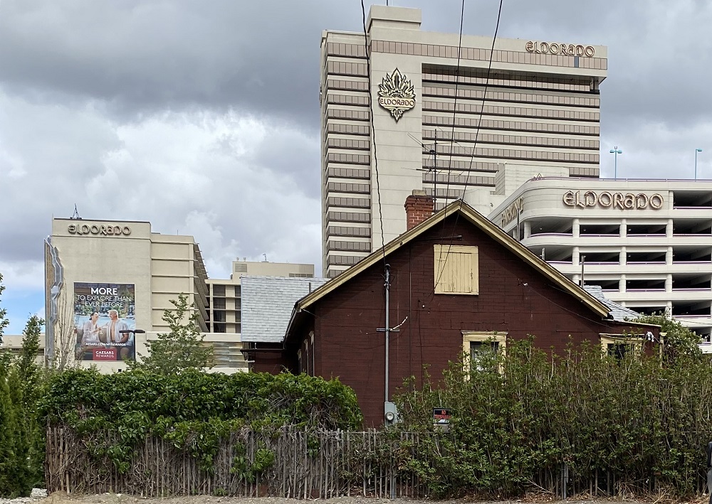 A view looking east from behind the Benham House shows its proximity to the Eldorado Casino Resort, which was built in the early 1970s, approximately 100 years after the house's construction. | Creator: Alicia Barber | Date: 2021Download Original File