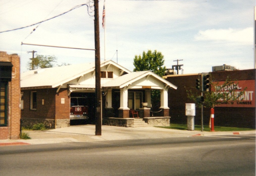 Seen in a photograph taken around 1986, the fire station housed a 1981 Seagrave pumper. The Imperial Restaurant on the right was located in the Hale building and on the left is the F.A. Greene & Co. building (see separate entries), both of which remain standing, although the station does not. | Creator: Jon Wagner | Date: ca. 1986Download Original File