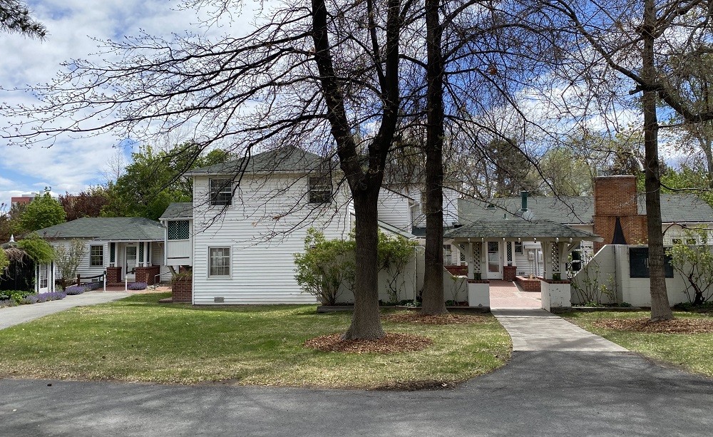 Pictured in 2022 is the side of the Herman House at Rancho San Rafael Regional Park. On the right is an outdoor patio with a built-in brick cooking area. | Creator: Alicia Barber | Date: 2022Download Original File