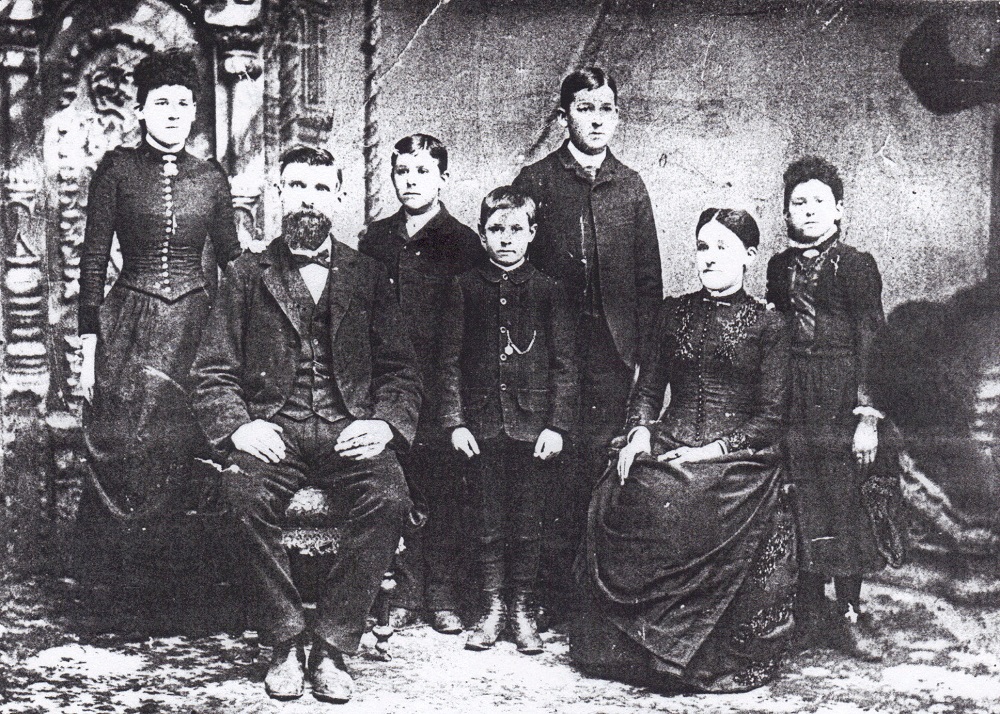 Members of the Litch family pose for a photograph around 1886. From left: Clara, Andrew, Thomas, George, Fred, Mary, and Minnie. | Date: ca. 1886 | Source: Jim Litch.Download Original File