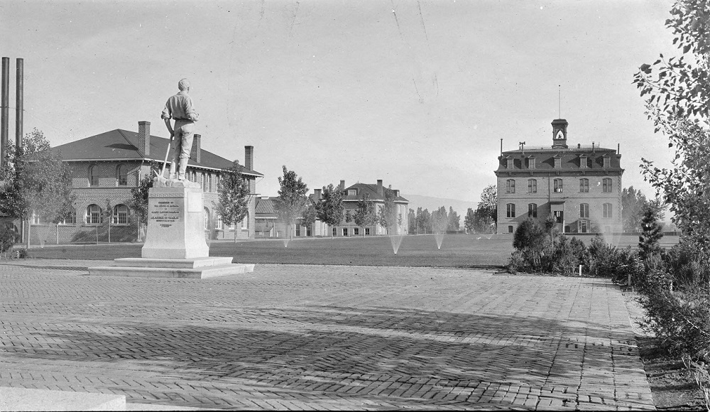 Creator: A view of the Quad around 1920 looks south past the statue of John W. Mackay toward Morrill Hall (right). | Date: ca. 1920 | Source: University Archives, University of Nevada, Reno LibrariesDownload Original File