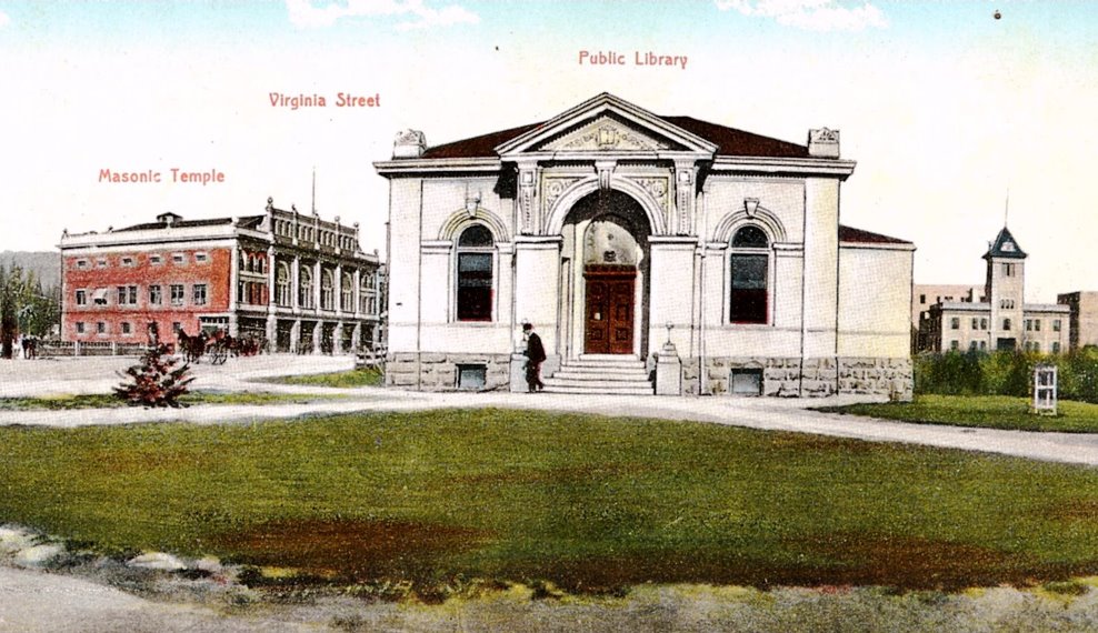A Reno landmark, ca. 1910 ID: 222 | This file appears in: Carnegie Free Public Library (site) The Carnegie Library appears in a panorama postcard, ca. 1910. Reno City Hall can be seen behind and to the right of the library, on the north side of the river. | Date: ca. 1910 | Source: Dick Dreiling Download Original File SourceDick Dreiling Dateca. 1910 "A Reno landmark, ca. 1910 " appears in: Carnegie Free Public Library (site)