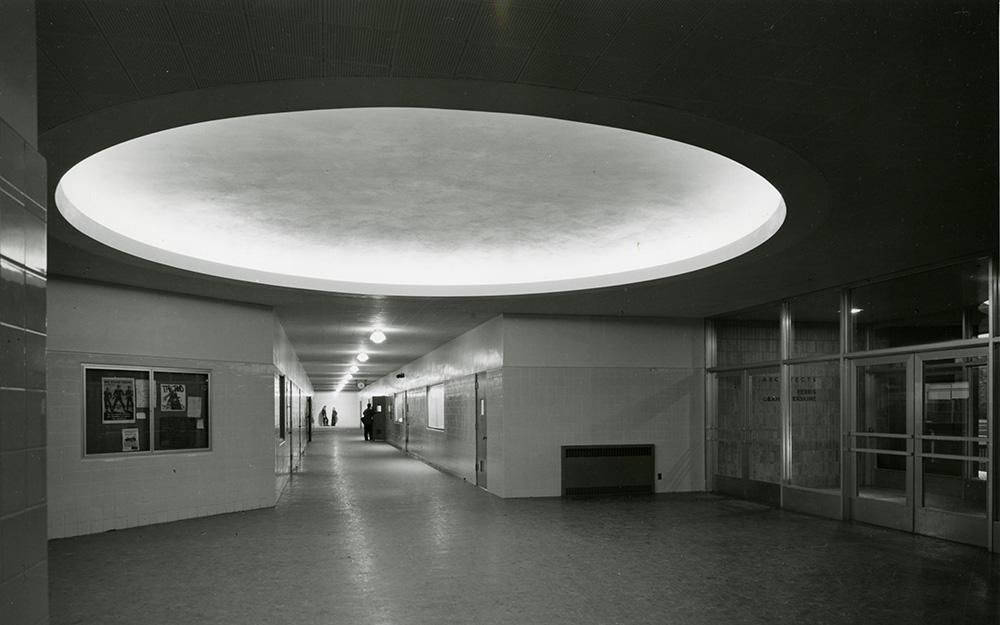 Bold features were included in the building design, such as the light and acoustic feature in the front entry often referred to as "the dome," which has the intriguing ability to amplify the voices and footsteps of those passing beneath it. | Source: Special Collections, University of Nevada, Reno Libraries Download Original File