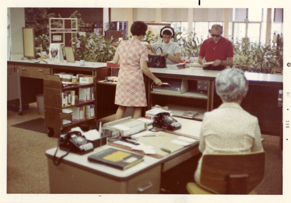 Checking out, 1970 ID: 295 | This file appears in: Washoe County Library A view from behind the service desk at the Washoe County Library, 1970. | Date: 1970 | Source: Washoe County Library Download Original File SourceWashoe County Library Date1970 "Checking out, 1970 " appears in: Washoe County Library