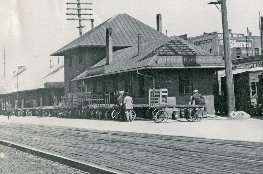 Prior to 1926, the American Railway Express office was located in Reno's main railroad depot, pictured here ca. 1918.