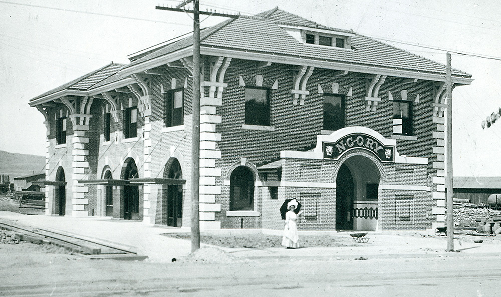 A stylish woman outside the new depot soon after its completion in 1910. On the left, the railway's tracks appear near completion, while the tracks for Fourth Street's streetcar line can be seen in the foreground. | Date: 1910 | Source: Neal Cobb and Jerry FenwickDownload Original File