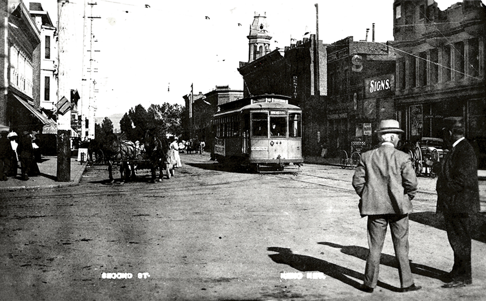 Second and Sierra Streets ID: 351 | This file appears in: Reno Traction Company (site) Here car No. 5 is about to leave Reno for Sparks, facing west on Second at Sierra. | Source: Special Collections, University of Nevada, Reno Libraries Download Original File SourceSpecial Collections, University of Nevada, Reno Libraries "Second and Sierra Streets " appears in: Reno Traction Company (site)
