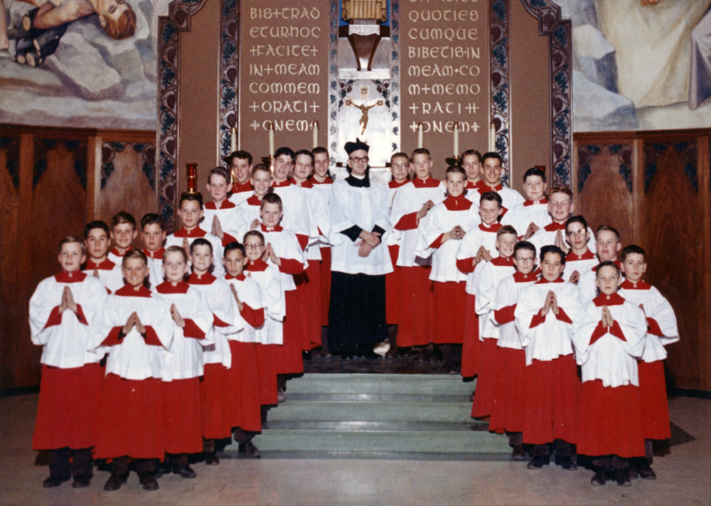 The bottom part of the famous mural by Edith and Isabel Piczek is seen on the right and left side of the altar. The Piczek sisters, exiles from Hungary, also designed the stained glass windows in the church. | Creator: George Kerr | Date: 1962 | Source: St. Thomas Aquinas CathedralDownload Original File