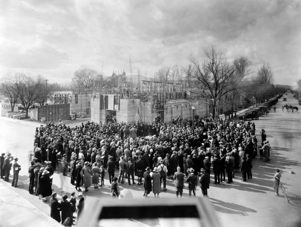 Laying the Cornerstone for the Methodist Church, March 30, 1926. Following a parade from the university, ceremonies included addresses by Governor James J. Scrugham, Mayor E.E. Roberts, and Walter E. Clark, President of the University of Nevada. The towers of St. Thomas Aquinas Catholic Church are visible through the construction.