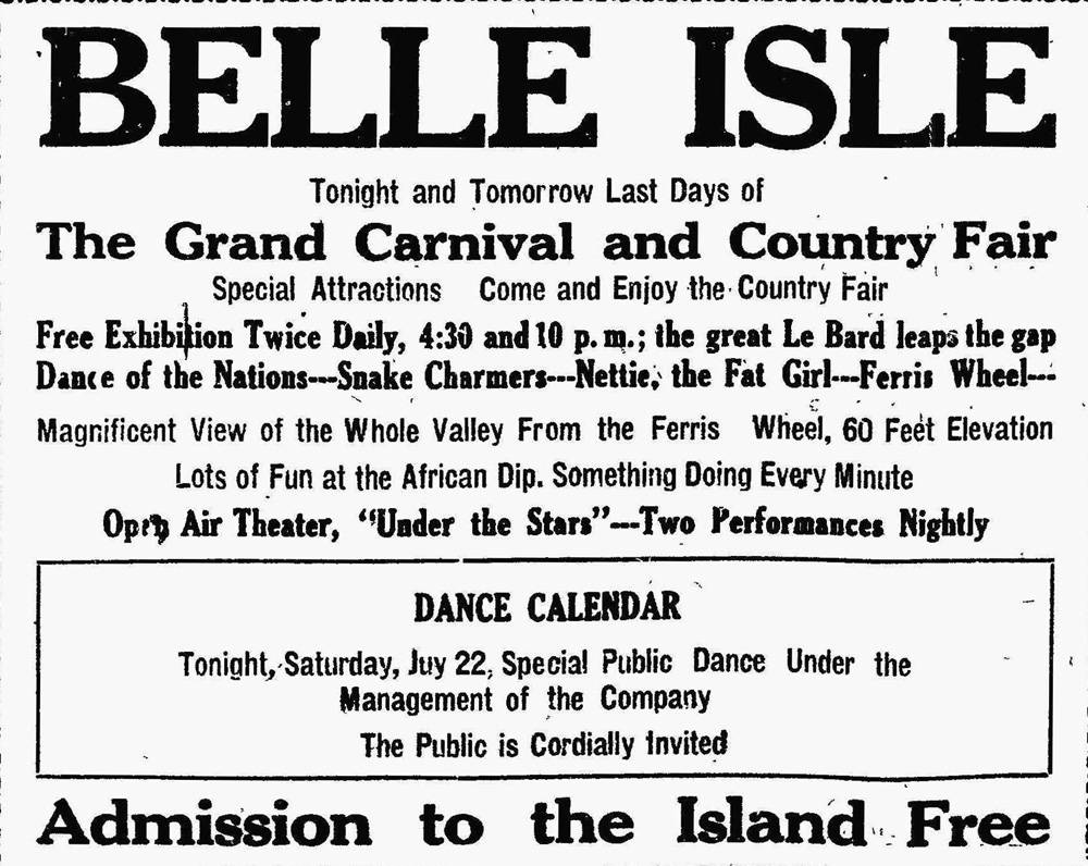 An advertisement promotes the wide range of entertainments offered by a visiting carnival and country fair on Belle Isle in July 1911.