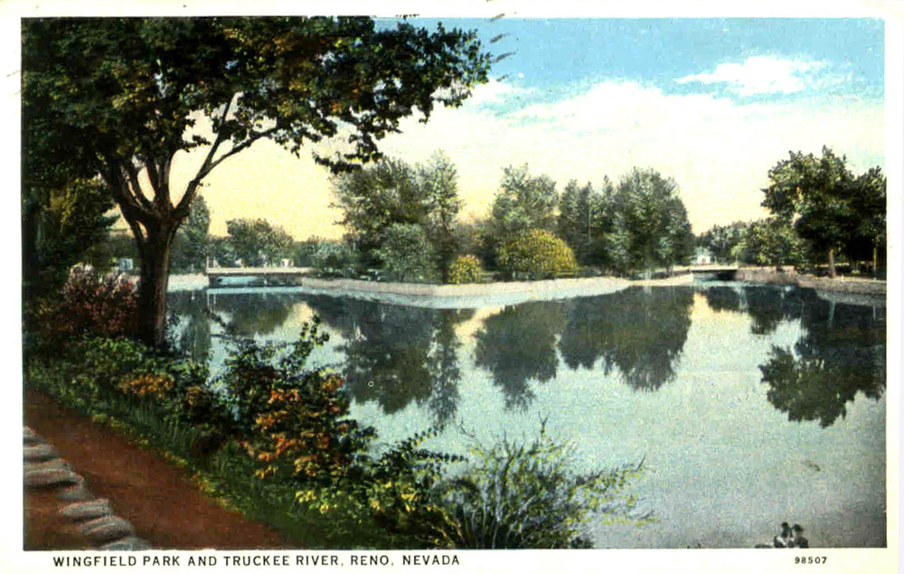 Verdant landscape ID: 412 | This file appears in: Wingfield Park An undated postcard shows the carefully tended landscaping on the banks of the Truckee River, looking toward Wingfield Park. | Source: Steve Ellison Download Original File SourceSteve Ellison "Verdant landscape " appears in: Wingfield Park